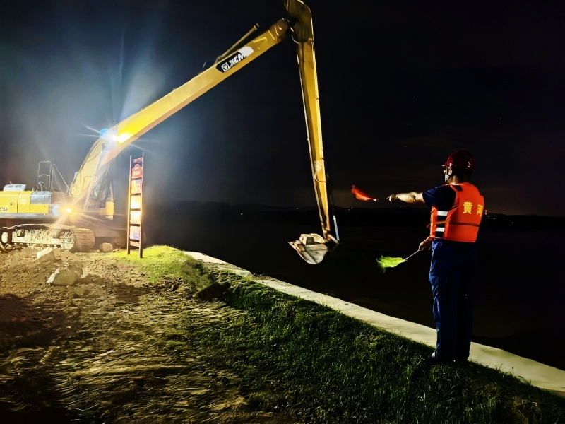 险工鏖战克难关,昼夜坚守保平安。7月2日,调水调沙迎来流量峰值,4130立方米每秒的河水奔腾而过。中午时分,范坡险工出现根石坍塌险情,该段即刻启动应急响应,配合上级技术人员探测出险情况并火速上报险情。随着抢险批复的下达,一场争分夺秒的战斗正式打响。机械轰鸣盖过蝉鸣,满载散石的自卸车陆续抵达,职工们在滚烫堤坝上挥旗指挥,长臂挖掘机精准抛投铅丝笼入水。夜幕降临,黑暗开始蔓延,应急照明一键开启,现场变得灯火通明。“守护蓝”在灯光下穿梭忙碌,指挥机械作业、检查抛石情况、协助搬运物料,成功筑起抵御水患的“钢铁长城”。
