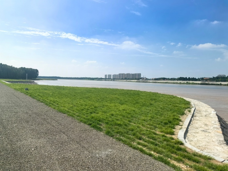 其间点缀的元宝枫、雪松、龙爪槐、红枫等绿化苗木高低错落,疏密有致,乔灌草的有机结合,既丰富了空间的层次感,又为黄河岸边增添了一抹清新的绿意。