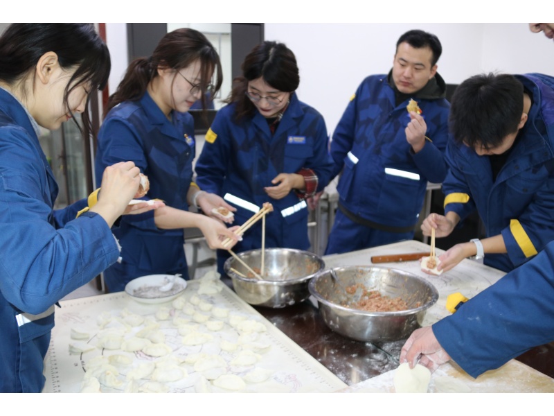 如果说庭院的红韵是眼中的年味,那食堂的饺香便是心里的团圆。小年食堂暖意氤氲,案板、面团、馅料依次铺开,职工们围站桌前,擀皮似铺展画卷,包馅若纳入祝福,捏褶像封存笑意,动作间流淌着默契与娴熟。“你这饺子包得真标致,不愧是治黄老手!”“跟着师傅学,多试几次就会!”老职工十指如飞,饺形匀称如珠;年轻人细心模仿,偶尔诞生的“创意饺”引来阵阵欢笑:“这个造型新颖,下锅可要稳住呀!”笑语拌着馅香在空气中发酵,年味带着温情在庭院中升腾。
