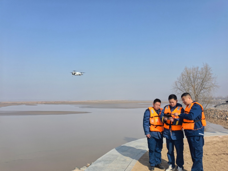 巡查队伍采取“无人机航拍+视频监控+人工徒步”的立体巡护模式,对王高寨、辛店集、老君堂三处重点靠水工程开展拉网式排查。蓝色身影踏过“春打六九头”的堤顶道路,用探摸杆检查根石稳固情况,通过“智巡APP”实时上传河势、水位等数据,确保险情早发现、早处置。在监控指挥中心,智慧防汛平台大屏上“防汛一张图”清晰直观,15处高清摄像头实时传回河道画面,水情、工情数据滚动更新,实现24小时不间断智能巡航预警。有了科技赋能,我们的巡查效率提升了3倍,重点坝段的细微变化都能及时捕捉。青年职工张东洲操控着无人机先是高空扫描,后是低空盘旋,手指在遥控器上灵活调整角度,目光紧盯着屏幕中河道影像不放过河道走势等任何细微变化。