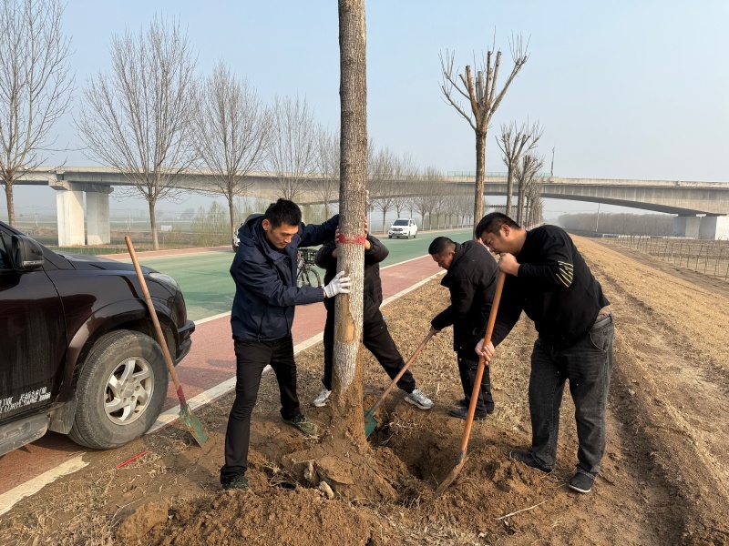 科学植树,精准补绿。该局遵循“因地制宜、适地适树”准则,精选抗风固土、适应性强的树种,科学安排种植区域,开展植绿护绿工作,让绿色在沿黄两岸不断扩展。栽植期间,人机协作,严谨认真,挖掘机准确开挖树坑,职工们分工合作,扶苗、填土、围堰、浇水,每一道工序都严格细致。联合东明县总工会举办义务植树活动,干部职工与志愿者共同栽树,春日的黄河堤坡上,一排排新苗挺拔,与石砌堤岸相互映衬成景,成为春日里一道美丽的风景线。“黄河银晖”老干部志愿服务队积极投入植树现场,退休职工扎根堤畔,一边栽树一边向青年职工传授固土防浪经验,用余热守护母亲河。