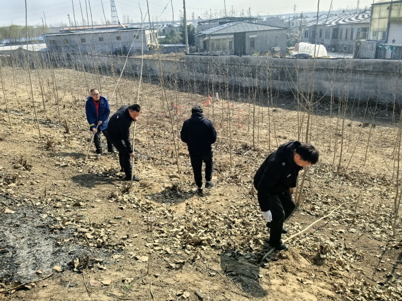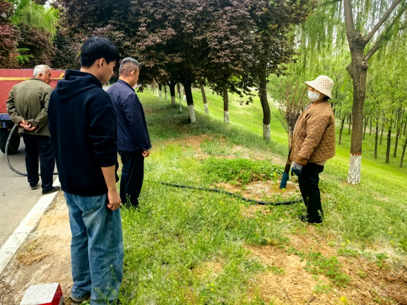 在管辖区域内一块不规则“三角地”上,职工对照规划图放线定位。拉紧卷尺,洒下白灰,纵横线条在褐色土地上勾勒出绿色版图。定点、挖坑、扶苗、培土……一株株适生树种悉心栽下,紧随其后的是定根水的及时浇灌——水桶穿梭,水管延伸,清冽之水浸润新土,确保每一株幼苗“安家”之初便吮吸充足水分,稳稳扎根。另一侧淤背区,满载杜仲树苗的卡车刚停稳,职工便迅速围拢,卸车、转运、修剪、蘸浆,各环节衔接有序。杜仲入土,浇水培实,行列整齐,迎风挺立。每一锨土的培覆,每一瓢水的滋润,都是对大地的深情叩问、对春天的郑重许诺。