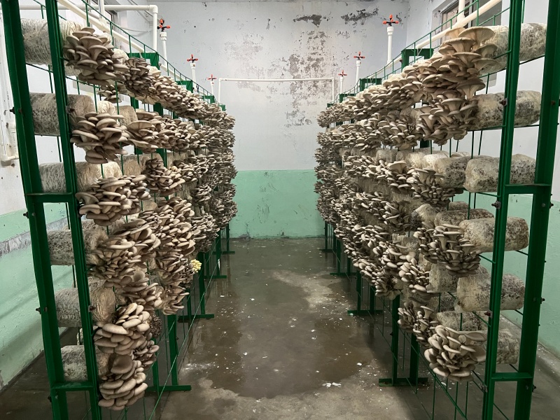 走进昔日的闲置厂房,如今已摇身一变,成为了恒温恒湿的现代化菌菇种植车间。一进门,湿润的空气裹挟着菌香扑面而来。放眼望去,一排排菌棒整齐悬挂,层层叠叠的平菇破袋而出,鲜嫩饱满,生机盎然。