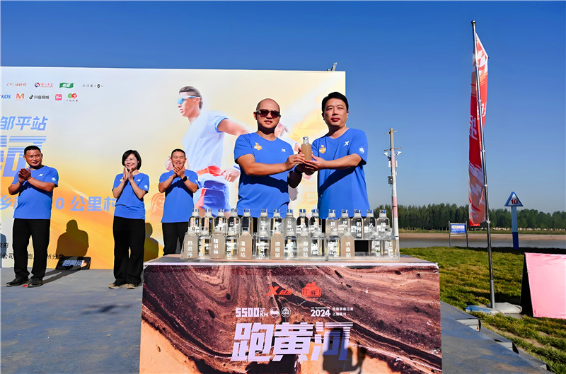 在起跑仪式上,活动嘉宾们来到黄河岸边抛桶取水,并将黄河水倒入预先准备的水瓶中,与前期20余个城市活动中收集的黄河水汇集一起,完成黄河“几”字拼图。色泽独特的黄河水,传递着中华民族的本色,也象征着跑步爱好者们的精气神。