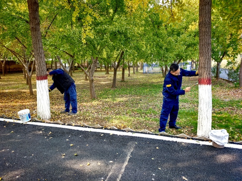 此次刷白作业严格遵循标准化要求,采用石灰混合制剂,重点对树干进行均匀涂刷。施工过程中,工作人员做到止口平整、高度一致、浓度均匀,确保全覆盖、无死角。树木刷白不仅能有效反射日光,调节树干昼夜温差,防止树皮因低温冻裂,更能有效杀灭树皮缝隙中越冬的病虫害源,显著降低来年春季病虫害发生率,是实现“防冻防虫”双效合一的重要管护措施。