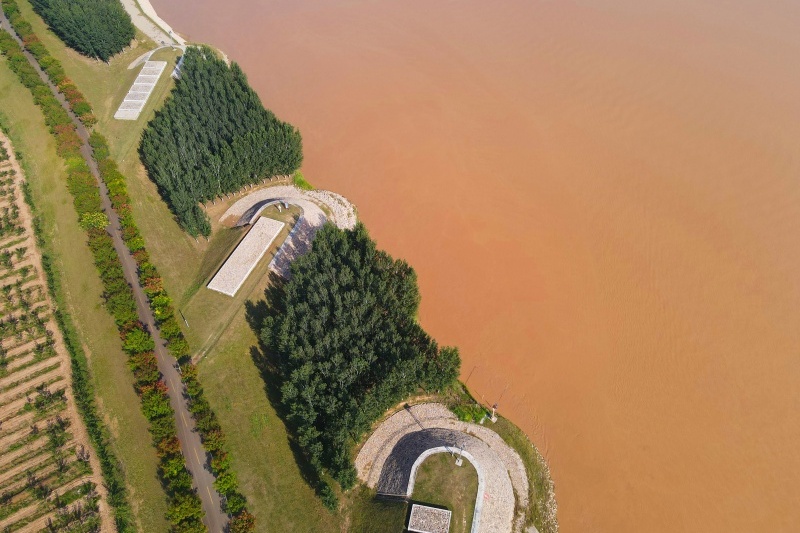 从无人机上俯瞰,河道整治工程的全貌豁然开朗。一道道丁坝与护岸,如同巨人的臂膀,守护着黄河的安澜。