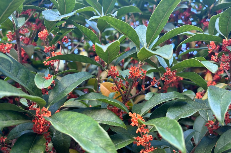 这个时辰,正是桂花飘香的季节。忘记哪本书里提过,根据开花的时序,桂花一般分为两种,月月开的称“木樨”,花朵较细小,呈淡黄色。另一种称“金桂”,只有秋天才开,花朵较大,呈金黄色。门口的这两株便是所谓的秋日“限定款”——“金桂”。