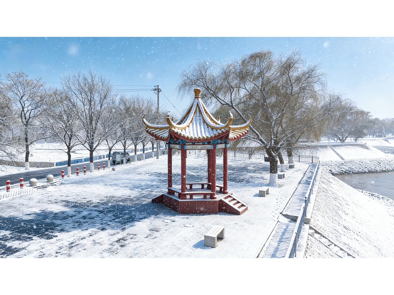 俯瞰雪村棋布,滩区迁建的屋舍如棋盘落子,雪垄横阡间烟火气与静谧交织,是滩区群众安居的缩影;琼阁临波,飞檐积雪映着晴光,古建与河湖相拥,晕染着滨城黄河的水韵乡愁;雪亭独立岸畔,红柱素瓦在碎玉里鲜亮,是旅人望河听雪的归处。