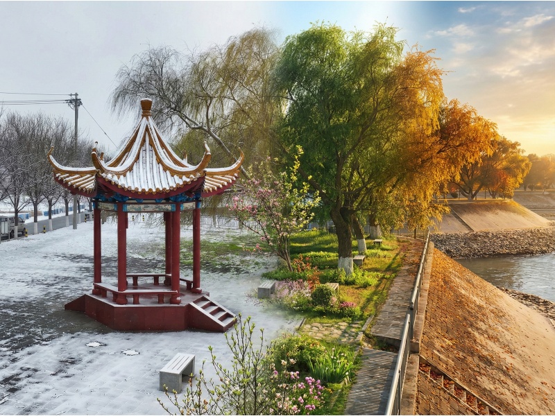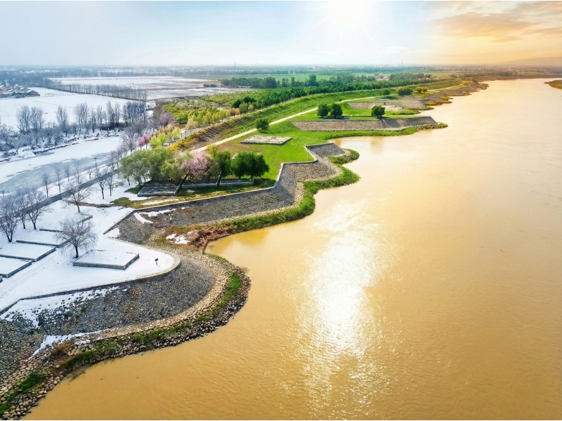 小街控导的石岸在残雪与新绿间蜿蜒,老柳抽芽时,河面上的冰凌正顺着春潮缓缓消融,石缝里的二月兰与护坡草籽一起苏醒,把“守护”种成了风景。道旭古渡的金属雕塑在暖阳里舒展线条,一旁的观景亭攒着半亭春雪、半亭杏花,引黄水闸的橙红小楼立在河湾,既是调水的枢纽,也是看云的檐角。
