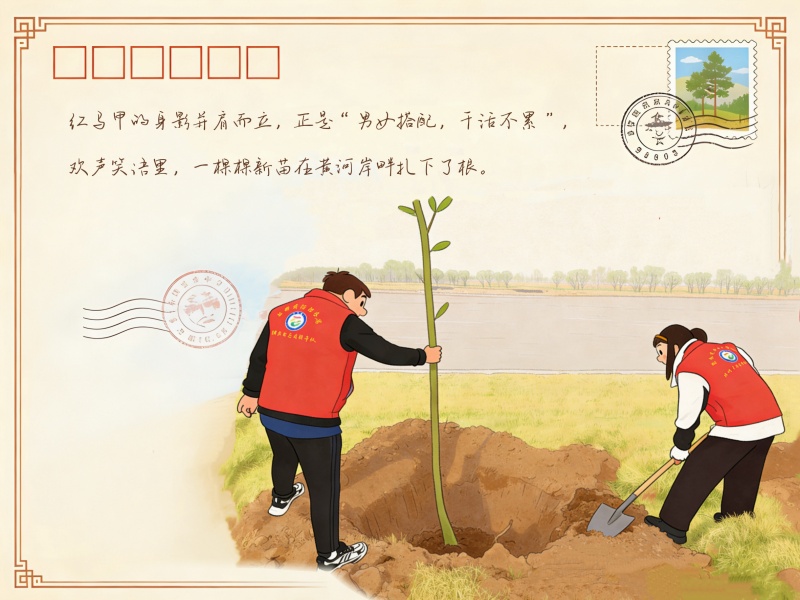 古老的黄河静静流淌,见证着这群年轻人用双手播撒生机。新栽的树苗在春风里轻轻摇晃,和青春的笑脸相映成趣,为母亲河续写着充满希望的绿色篇章。(杨雅晴)