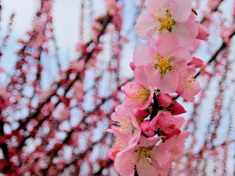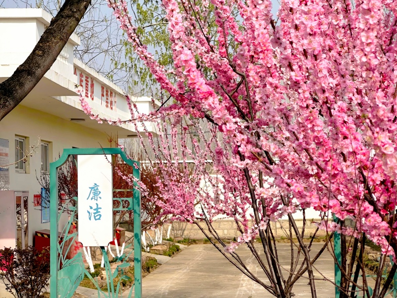 庭院里,重瓣榆叶梅垂落满枝粉霞,花影映着“廉洁”风骨,添了几分清雅端庄。