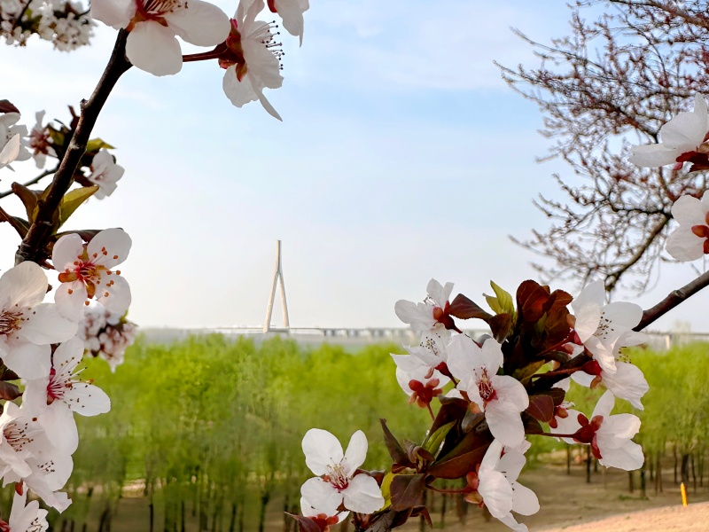 望向河的方向,大桥静卧碧波,春花作框,框住黄河春日的辽阔。风拂柳林,新绿漾起涟漪,与繁花相映,是岸畔独有的生机诗意。