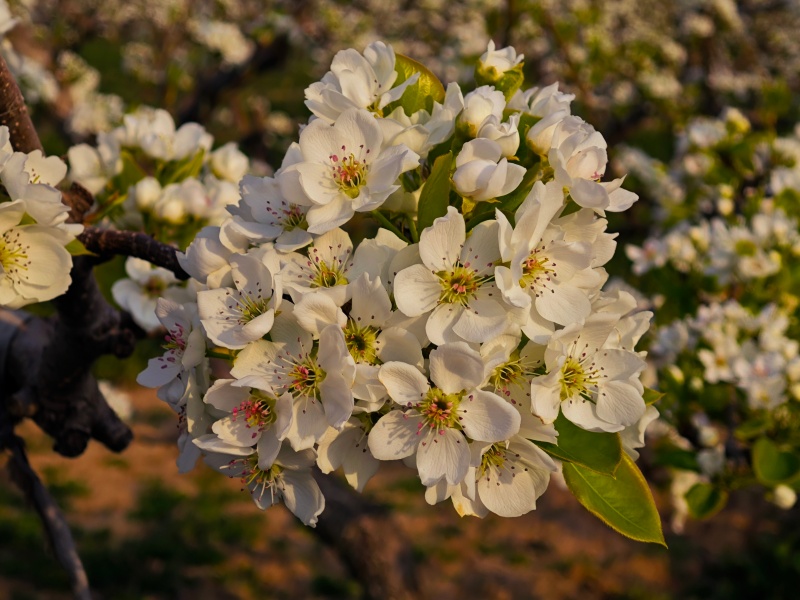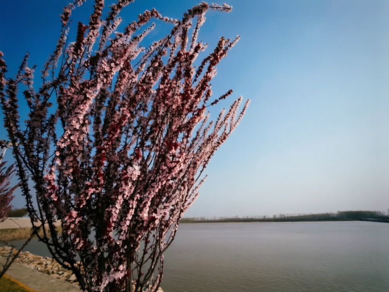 风从河面腾起,裹挟着泥沙的质朴与水汽的清凉,吹过堤岸。柳枝随风轻摆,如少女初洗的长发,在风中舒展出一派生机。堤坡之上,繁花似锦,开得热烈而从容:那是紫叶李的素白,洁净如雪;那是海棠的娇柔,粉艳欲滴;亦是梨花的清雅,洁白胜雪。