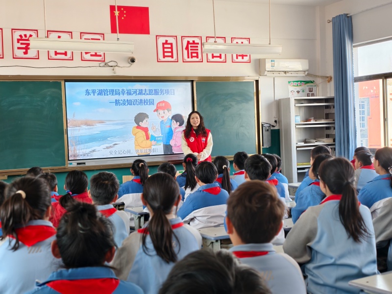 本站1月26日讯 凛冬时节,防凌护安正当时。1月22日,东平湖管理局“一湖平 万户宁”志愿服务队走进东平县戴庙镇中心小学,开展“防凌知识进校园 平安快乐度寒假”志愿服务活动,为孩子们带来了一堂别开生面的防凌安全知识小课堂。此次活动旨在将黄河凌汛防范的种子播撒进青少年的心田,筑牢黄河滩区周边水域群众防灾减灾的“思想堤坝”。
