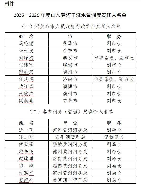 为落实2025—2026年度山东黄河干流可供水量分配计划,根据《黄河水量调度条例》(国务院令第472号)关于黄河水量调度实行地方人民政府行政首长负责制和黄河水利委员会及其所属管理机构以及水库主管部门或者单位主要领导负责制的有关规定,现将山东黄河干流水量调度责任人名单(见附件)予以公布。