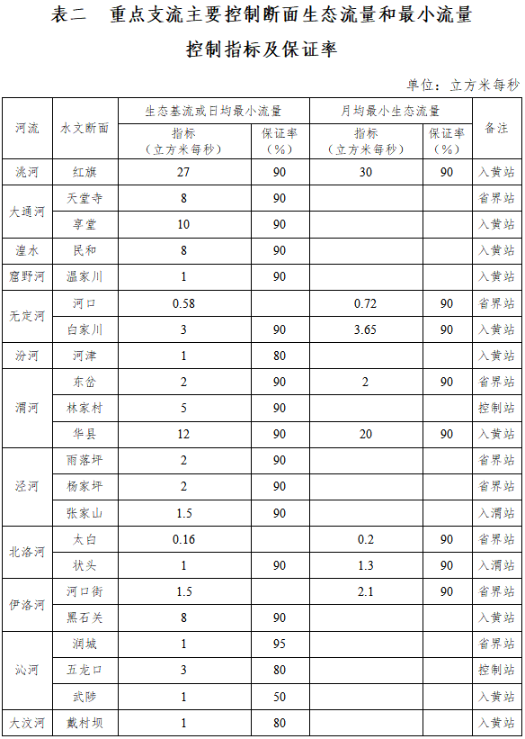 实施水量调度管理和纳入生态流量监管的12条重点支流主要控制断面生态流量及最小流量控制指标见表二。