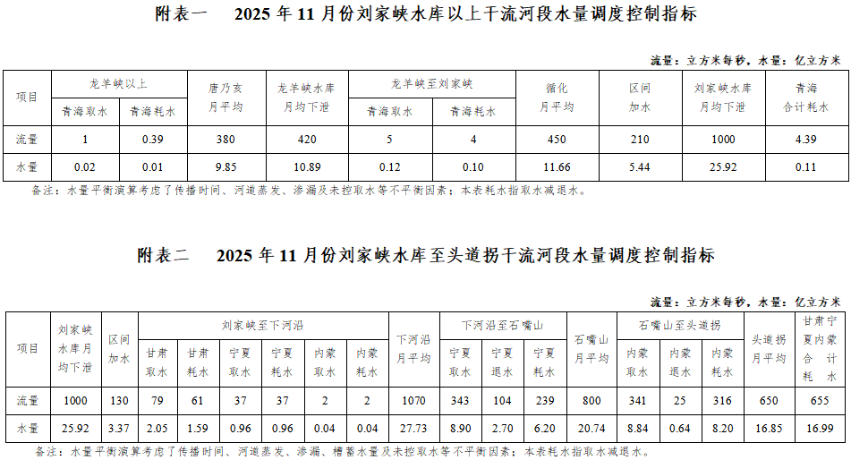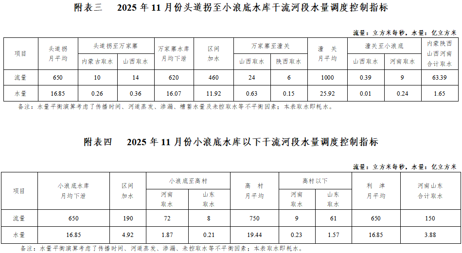 11月份,龙羊峡水库平均下泄流量按420立方米每秒控制;刘家峡水库平均下泄流量按1000立方米每秒控制;万家寨水库以防凌运用为主;三门峡水库按不超过318米控制运用;小浪底水库和西霞院水库联合调度,平均下泄流量按650立方米每秒控制。兰州、花园口、利津三个主要控制断面日均流量分别按不小于350、200、50立方米每秒控制。